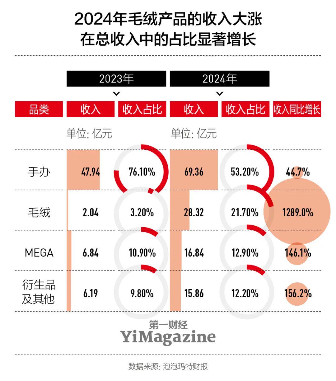 3月26日,泡泡玛特发布2024年财报,一直以来备受质疑的它交出了一份出人意料的成绩单。2024年,泡泡玛特实现130.38亿元营收,相比2023年增加了一倍多;经调整净利润34.03亿元,同比增长185.9%,表现出了极强的盈利能力—作为对比,全球玩具巨头美泰2024年获得了53.8亿美元(约合392.7亿元人民币)的收入,但其全年净利润也仅有5.42亿美元(约合39.6亿元人民币)。