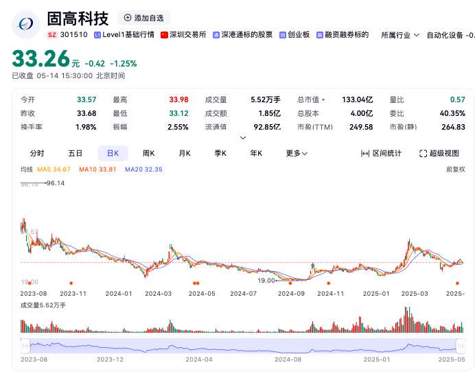 截至2025年5月14日,固高科技报收33.26元/股,总市值133亿元。