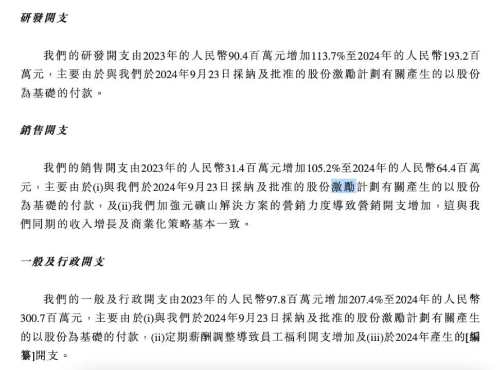 三大费用在2024年的大幅增长,则与一份股权激励计划有关。递交《招股书》前七个月,2024年9月,希迪智驾采纳及批准一份股份激励计划,为此希迪智驾2024年以股份为基础的付款达3.135亿元。这笔费用被分散在三费之中。