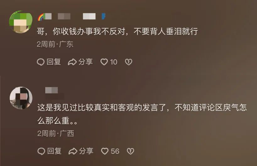 有网友留言“这就是典型的:不是你给老板打工,是老板给了你工作”,还有人说“此时此刻黄世仁在偷笑,他就喜欢这样的杨白劳”,甚至还有评论质疑他发布视频的动机是“拿钱办事”。这一幕,不禁令人联想到粉丝为了守护偶像,冲到其他明星话题词条下面互撕攻击的常规操作。而各种一边倒的评论,也成功吓到了路过的网友,“不知道评论区戾气怎么那么重”。