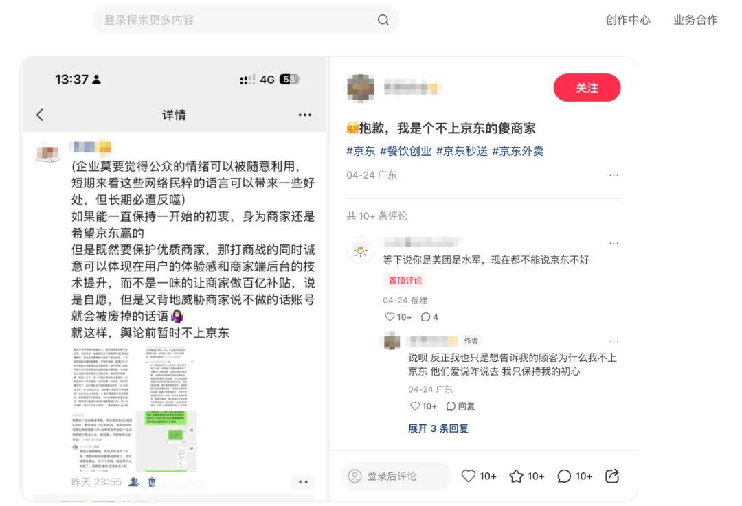 有的账号前一篇笔记还在分享如何用二十四节气取小名,后一篇就跨界商业领域讨论“京东加入外卖,普通人的机遇有哪些?”。有的账号本来是在小红书做一件代发、礼品定制的业务,突然又发布刘强东请外卖骑手吃火锅的4分钟高清视频。还有疑似“僵尸”账号,其主页只发布了一篇笔记,但内容却是斥责竞争对手平台的高佣金和外卖健康问题。这些异常的账号和内容,也颇有些饭圈利用水军发稿、带节奏抹黑“对家”的影子。