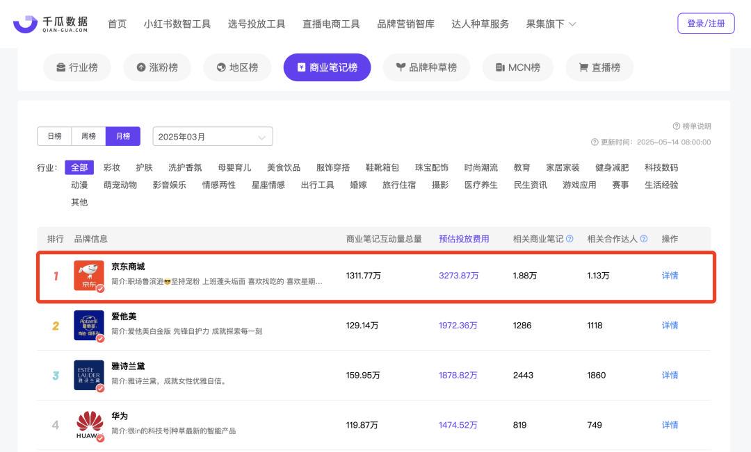 千瓜数据显示,仅仅是在小红书平台上,京东从今年2月开始加大投入,3月份的预估投放费用高达3273.87万元,较前一个月的874.30万元增加了274%,位居商业笔记榜第一。但从实际情况来看,京东的投放可能过于“饱和”了。
