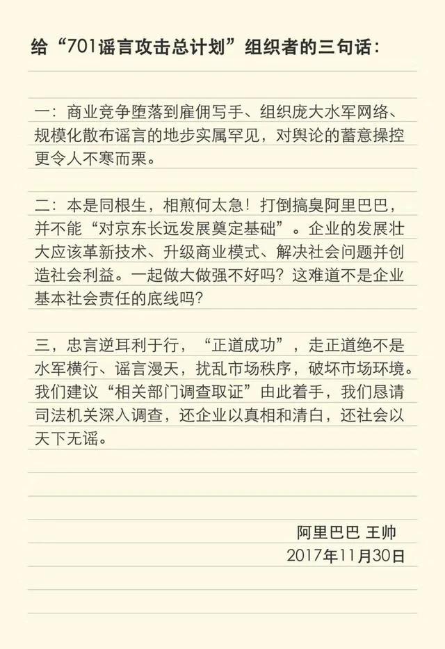 阿里巴巴市场公关委员会主席王帅,在2017年11月30日公开发布的《给“701谣言攻击总计划”组织者的三句话》中提到,“打倒搞臭阿里巴巴,并不能‘对京东长远发展奠定基础’”。