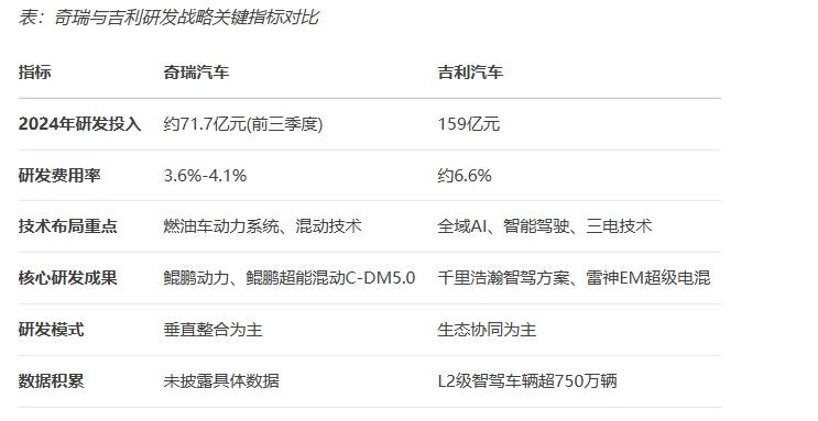 研发投入作为衡量企业创新力的核心指标,在奇瑞与吉利这两家车企之间呈现出鲜明的不同路径。
