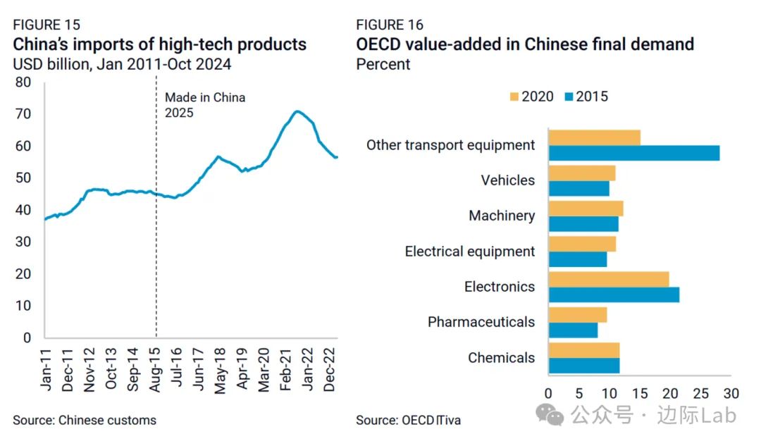 2.尽管中国在降低进口依赖方面取得显著进展,其产业升级推动也带来了对高技术产品的更高需求。过去十年间,中国高技术产品出口从2015年的约6500亿美元增长至2023年的约8500亿美元;但同期高技术进口也几乎同步增长,从5500亿美元上升至6900亿美元,导致高技术贸易顺差仅从1000亿美元扩大至1600亿美元。由于高技术产品进口的增长,2015至2020年间,在多数制造业领域中,中国最终需求中来自经合组织(OECD)国家、并嵌入其中的增加值占比上升,唯有电子和其他运输设备(如船舶和飞机)除外。