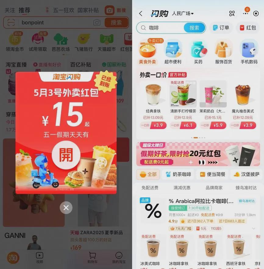 去年10月,结合淘天体系内多元丰富的品牌商家资源,饿了么开启近场品牌官方旗舰店战略,在餐饮侧和零售侧打开品牌线下旗舰店与消费者之间的通路;今年4月,淘宝天猫旗下即时零售业务“小时达”正式升级为“淘宝闪购”,联合饿了么共同加大补贴,全力围绕消费者提供最大福利优惠。