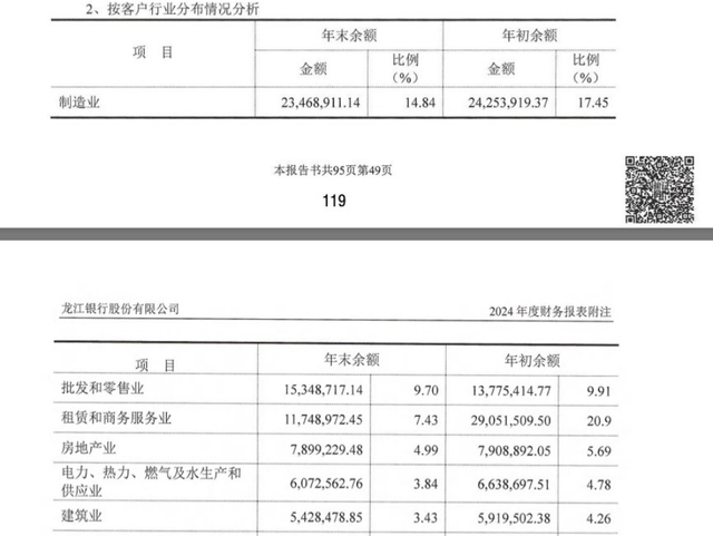 与此同时,2024年龙江银行的信贷资源仍主要投向租赁和商务服务业、制造业、批发和零售业、房地产业和电力、热力、燃气及水生产和供应业五大行业,但集中度已经降低,前五大行业占贷款总额的比重为40.8%,2023年这一数据为67.6%。