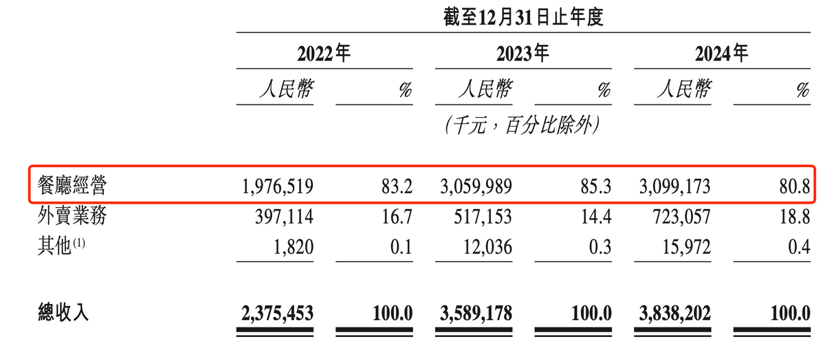 按收入类型来看,绿茶集团2024年的餐厅经营收入约为30.99亿元,较2023年仅微增1.3%。