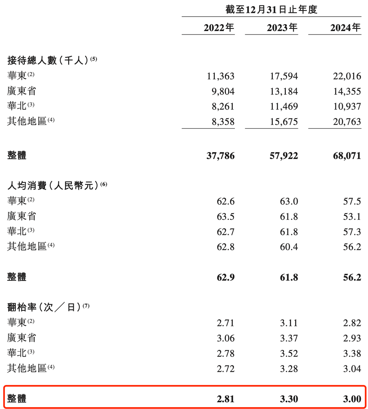 据招股书数据,2022年至2024年,绿茶集团每家餐厅日均接待人数分别为444人、516人、477人;对应的客单价分别为62.9元、61.8元和56.2元;公司翻台率分别为2.81次/日、3.30次/日和3.00次/日。