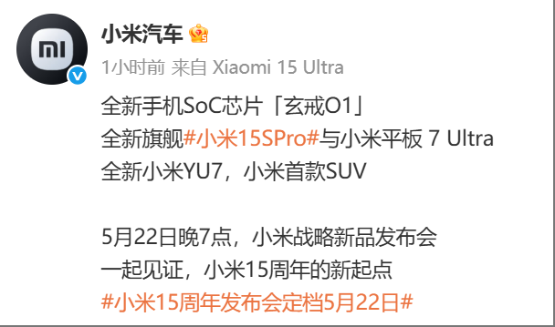 5月19日,小米汽车在官方微博宣布,将于5月22日19点发布小米SUV车型YU7,自研手机SoC芯片玄戒O1和小米15SPro旗舰手机将于同日发布。
