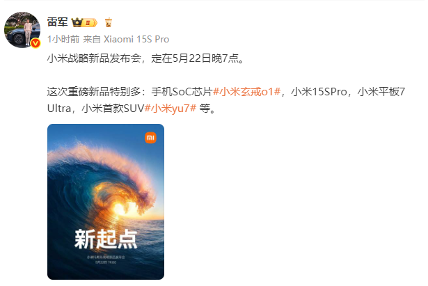 此前一小时,雷军微博官宣小米战略新品发布会,定在5月22日晚7点。他表示这次重磅新品特别多:手机SoC芯片小米玄戒O1,小米15SPro,小米平板7 Ultra,小米首款SUV小米yu7等。
