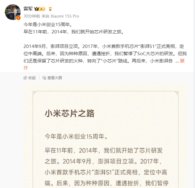 红星资本局5月19日消息,今天上午,雷军在个人微博发长文谈小米芯片之路。