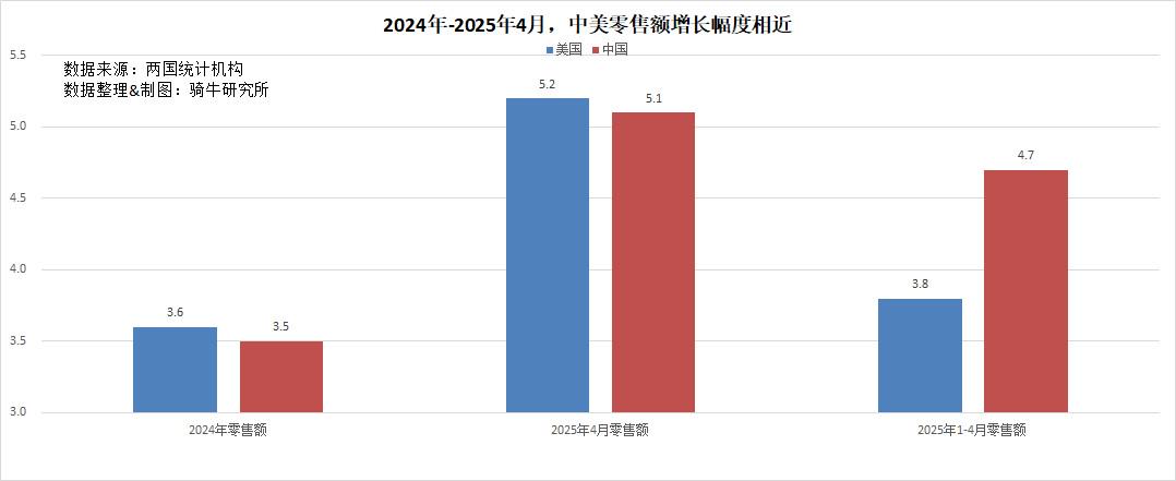 2025年前四个月,美国零售额2.73万亿美元,同比增长3.8%;中国零售额为16.18万亿,同比增长4.7%,中国零售额增幅仅比美国高0.9个百分点。