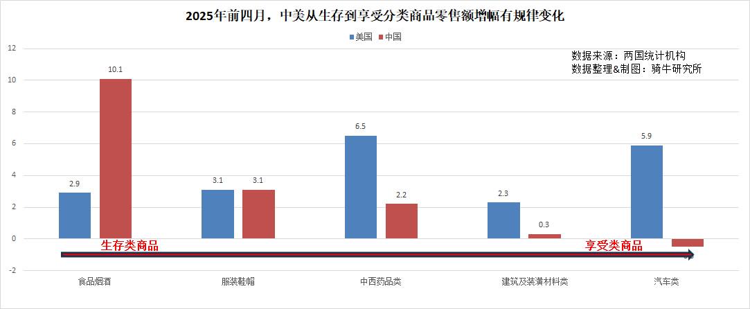 所以我们深入分析可以看到,前四个月,基础生存类的食品烟酒零售额,中国增长了10.1%,美国仅增长2.9%;反映生活健康需求的药品零售额,中国增长2.2%,美国增长6.5%;反映生活质量的建筑装潢材料类,中国微增0.3%,美国增长2.3%;反映享受型需求的汽车类零售,中国下降了0.5%,美国增长了5.9%。