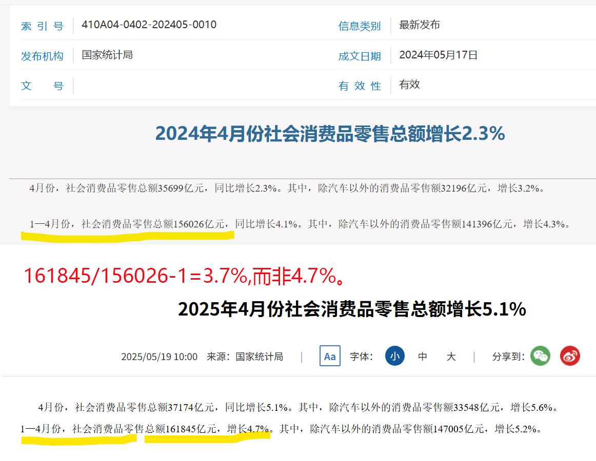 上图是国家统计局发布的2024年1-4月商品零售额156026亿元的报告,以及2025年1-4月商品零售额161845亿元的报告。按这两个数据相除,商品零售额仅增长3.7%,而非报告中的4.7%。可能是计算误差导致增幅多算了1个百分点。
