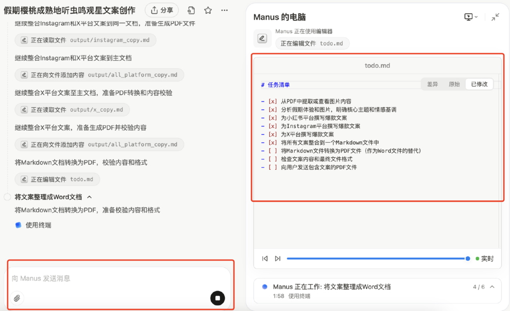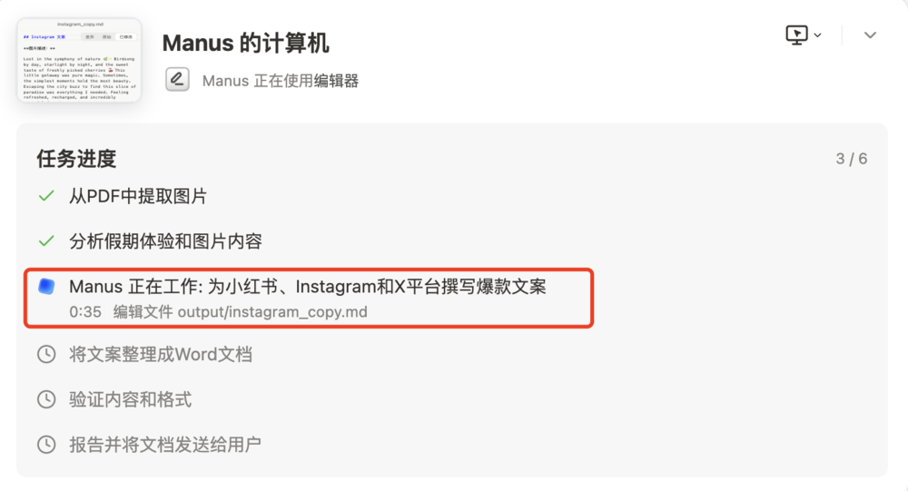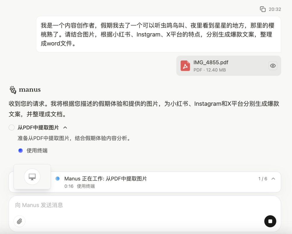 根据官方发布的简历筛选、股票分析、房地产调研演示的经验,预期中Manus将直接交付完整成果。因此,此次测试将上传四张图片附件,再写一段描述文字给Manus,要求它根据小红书、Instgram、X等平台的特点,分别生成爆款文案,整理成一个word给我。