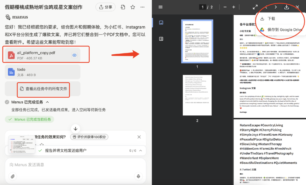总的来说,在测评任务中,Manus 支持多种任务类型,例如文案生成、短视频脚本及分镜创作,并且能够输出多种形态的交付结果,一定程度上降低了普通内容创作者的门槛,也能提供一些创作灵感。