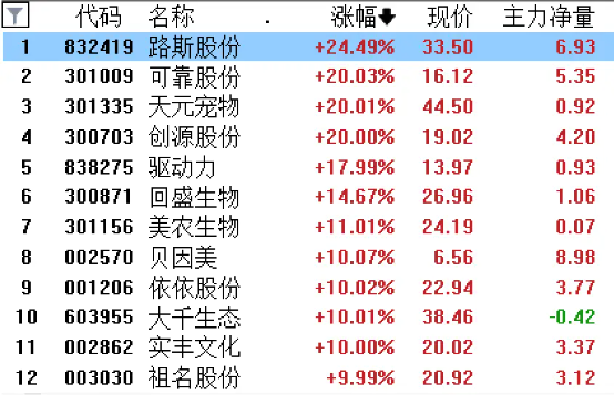 反观宠物经济板块,今天冲上了涨幅榜第一,路斯股份、天元宠物等多只个股嗨到飞起。