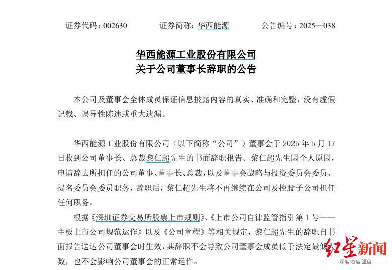 微成都报道5月20日,ST华西(华西能源,002630.SZ)公告称,董事会于5月17日收到公司董事长、总裁黎仁超的书面辞职报告。黎仁超因个人原因,申请辞去公司董事、董事长、总裁,以及董事会战略与投资委员会委员、提名委员会委员职务,辞职后不再在公司及控股子公司担任任何职务。