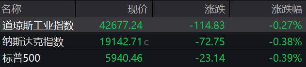 当地时间周二,美股三大指数集体收跌,道指跌0.27%,纳指跌0.38%,标普500指数跌0.39%。