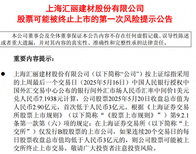 5月20日晚间,汇丽B(900939)公告称,公司股票2025年5月20日收盘总市值为人民币2.90亿元,首次低于人民币3亿元。根据《上海证券交易所股票上市规则》,若连续20个交易日的每日股票收盘总市值均低于人民币3亿元,公司股票可能被上交所终止上市交易。这是公司可能触发市值退市的第一次终止上市风险提示公告。