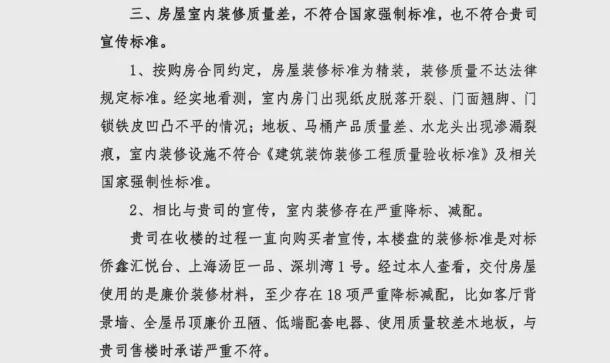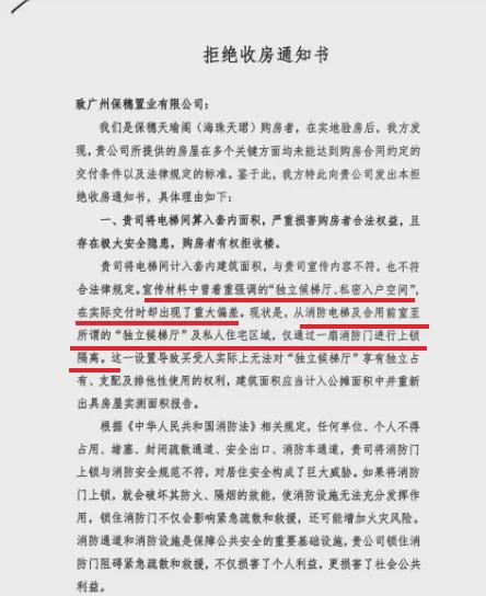 除了被指“虚增”面积外,据海珠天珺业主联名发布的《拒绝收房通知书》还提到“房屋室内装修质量差,不符合国家强制标准,也不符合开发商的宣传标准”,称“存在严重降标、减配”等。