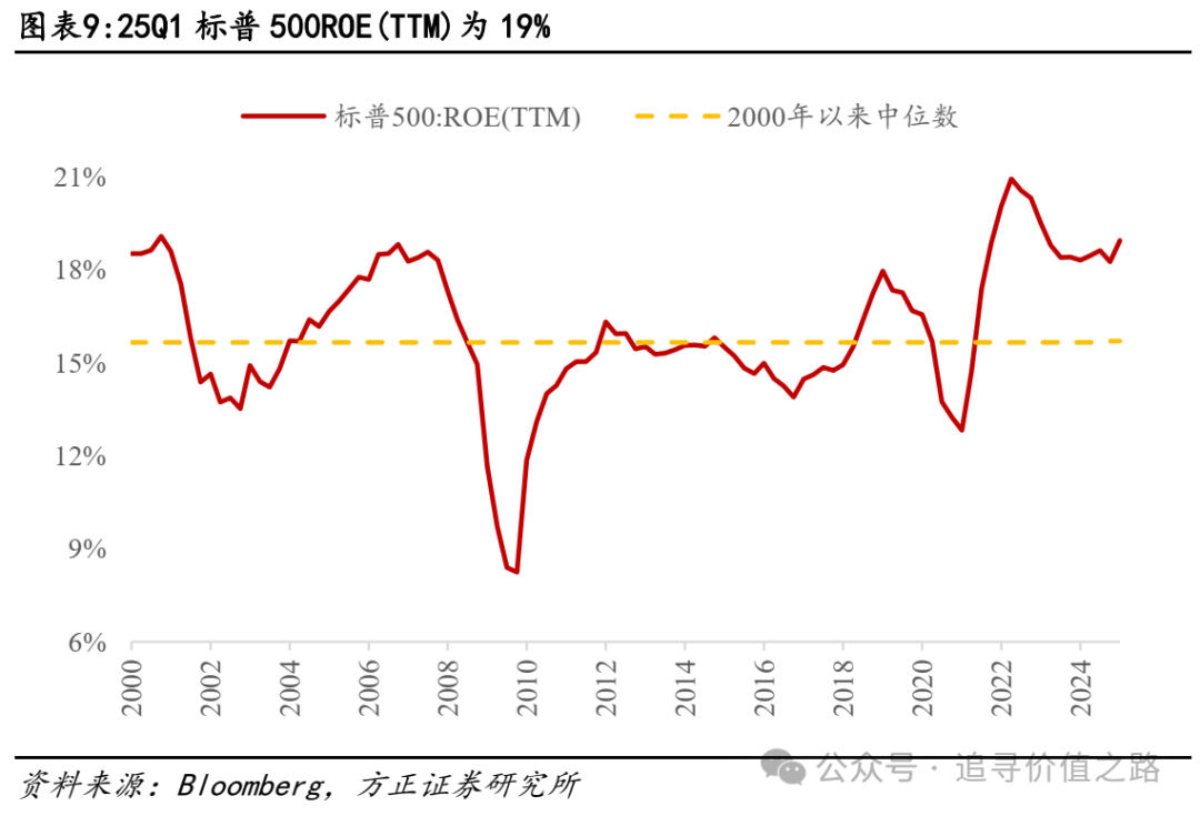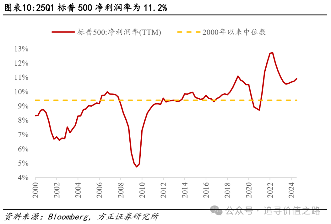 按净资产收益率(ROE)计算,25Q1标普500的ROE(TTM)为19.0%,较24Q4(18.3%)边际提升,绝对值仍然不低,且净利润率仍然稳健。22H2开始标普500ROE波动下降,24Q2首次提升,目前仍高于2000年以来中位数(15.7%)和过去10年中位数(16.6%)。而按杜邦分解看,24Q3ROE三因素中的净利润率(TTM)为11.2%,延续23Q4以来的上行趋势,反映利润层面,截至25Q1美股仍相对平稳。