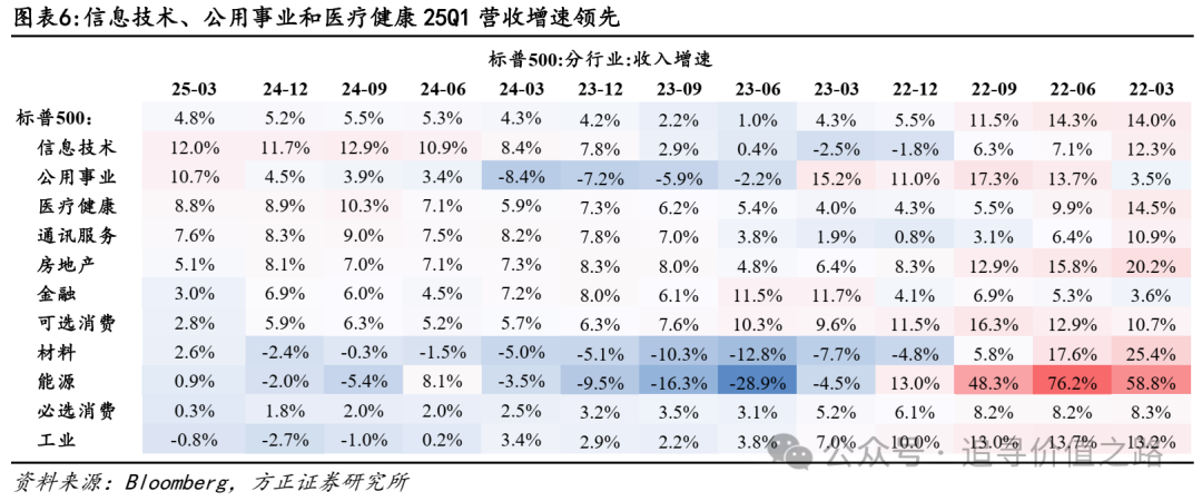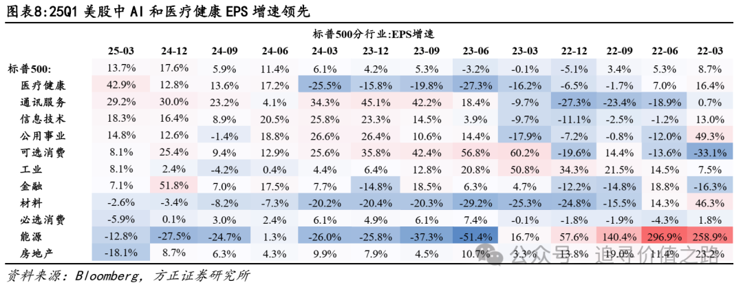 分板块情况看,25Q1美股中AI和医疗健康板块营收增速领先,工业、必选消费和能源相对靠后。25Q1营收增速中,信息技术、公用事业、通讯服务等泛TMT行业增速分别为12.0%、10.7%、7.6%,在11个行业中保持领先。信息技术、通讯服务主要受益于AI产业的推动,而公用事业受益于AI热潮中数据中心建设加快,对电力需求带来推动,因此也属于AI相关产业。而医疗健康以8.8%的增速位居第三,主要由医药板块带动。而工业(-0.8%)、必选消费(0.3%)、能源(0.9%)等表现相对偏弱。