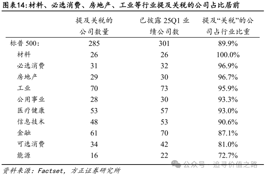 分行业层面看,美股大部分行业对关税风险均明显担忧,其中材料、必选消费、房地产、工业等尤为靠前。按提及关税的公司数占已披露业绩公司数占比看,这一比例在25Q1的标普500是89.9%,也即约九成企业均在考虑关税风险。其中,材料(100%)、必选消费(96.9%)、房地产(96.7%)、工业(95.9%)等占比靠前,而能源(72.7%)、可选消费(81%)比例相对靠后,但总体看美股大部分行业均表现出对关税风险的显著担忧。