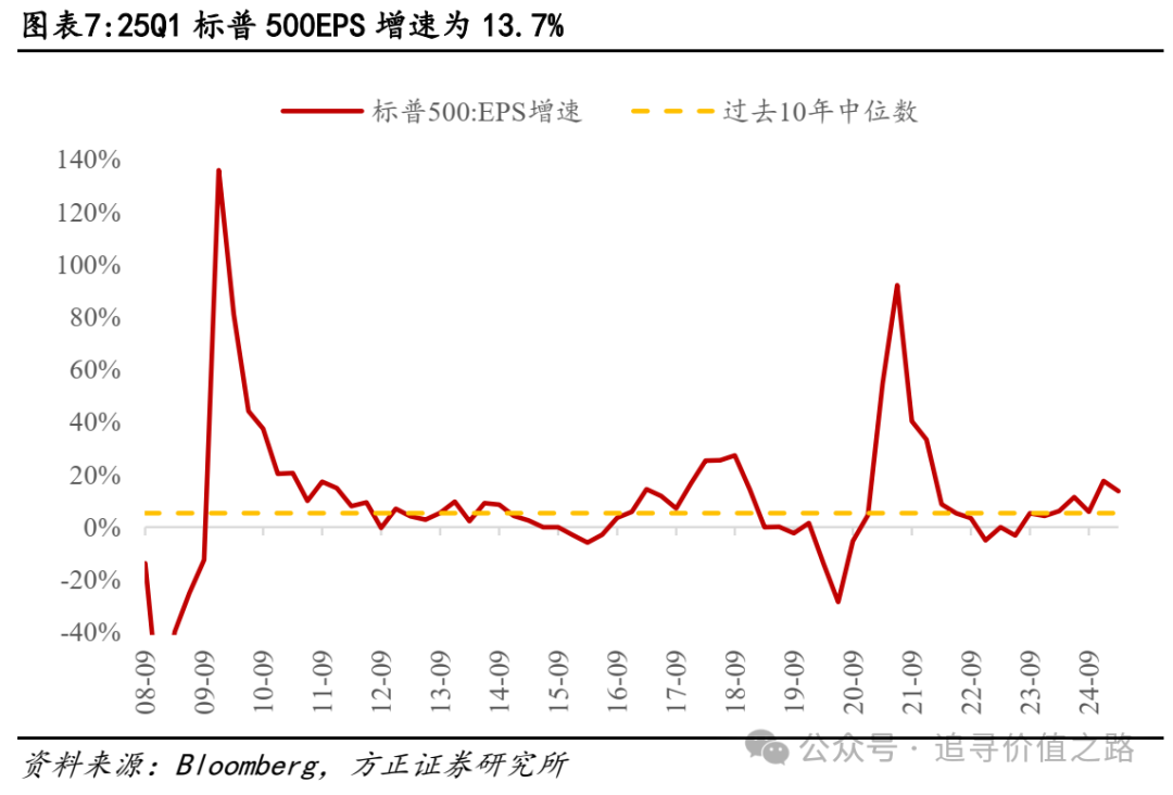 截至25Q1,标普500EPS增速为13.7%,较24Q4(17.6%)边际回落,但仍处于较高水平。与收入相比,市场通常更关注EPS(每股盈利)。25Q1美股EPS增速显著好于营收,且高于过去10年中位数(5.3%)和过去5年中位数(5.6%)。即使剔除基数效应、采用两年复合计算,25Q1美股盈利仅小幅下滑但维持高位(10.7%→9.8%),反映盈利端仍较为稳健。