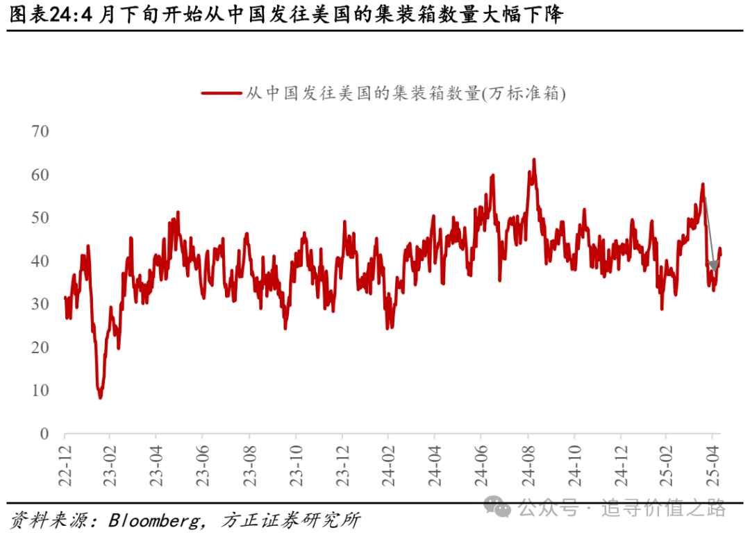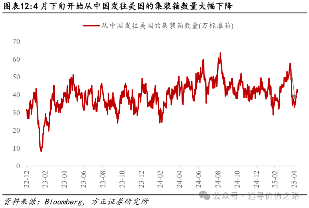 从宏观视角看,5月开始关税对美国经济的影响或逐步体现。从集装箱高频数据看,从中国发往美国的集装箱数量在4月下旬后才开始大幅下降,意味着5月开始库存消耗问题或逐步显现,对美国经济以及上市公司的压力加大。