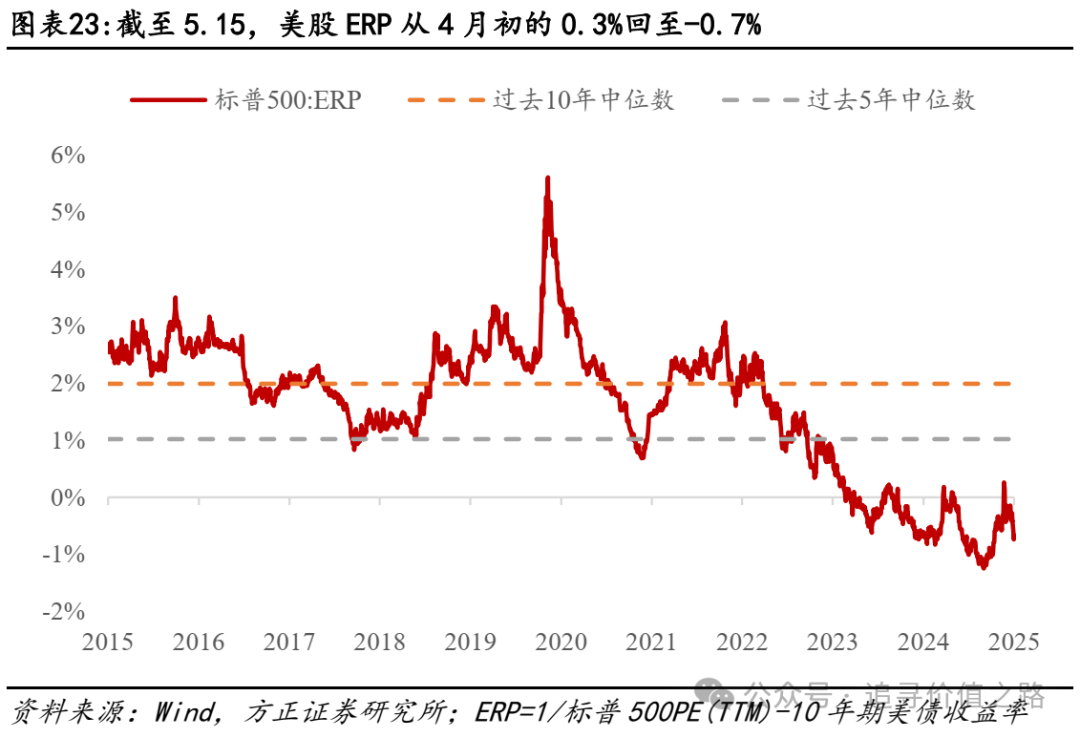 从资产比价视角看,美股ERP仍处于较低位置,或对后续美股继续上涨构成一定制约。通过计算标普500ERP(股权风险溢价),随着4月中旬以来美股持续拔估值+美债利率在4.2%以上居高不下,美股ERP从4月初的0.3%回至-0.7%,在过去10年区间中处于偏低水平,也远低于过去10年中位数(2.0%)和过去5年中位数(1.0%)。较低的ERP水平,意味着美股资产的性价比状况相对一般,或对后续美股持续上涨构成一定制约。