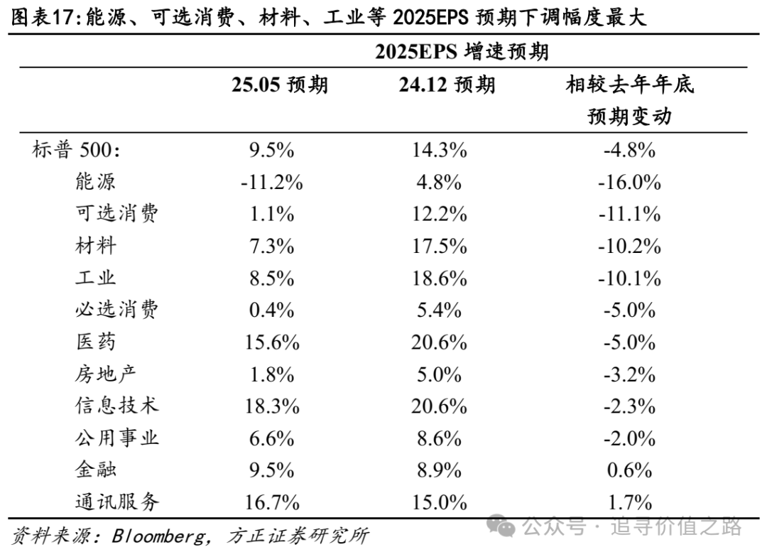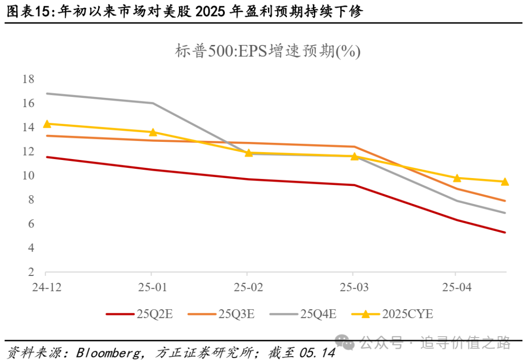 体现在盈利预期上,年初以来市场对美股2025年盈利预期持续下修,二季度美股盈利增速或将显著下滑。从全年维度看,市场对标普500的2025年盈利预期增速从去年年底预期的14.3%降至9.5%,对25Q2的盈利预期增速从去年年底预期的11.5%降至5.3%。尤其是从3月后,市场对美股全年盈利预期加速下修,主要源于对关税的担忧加大。按照市场预期推演,25Q2开始美股盈利增速将较24Q4-25Q1显著下滑,关税对美股盈利的冲击在二季度将持续体现。