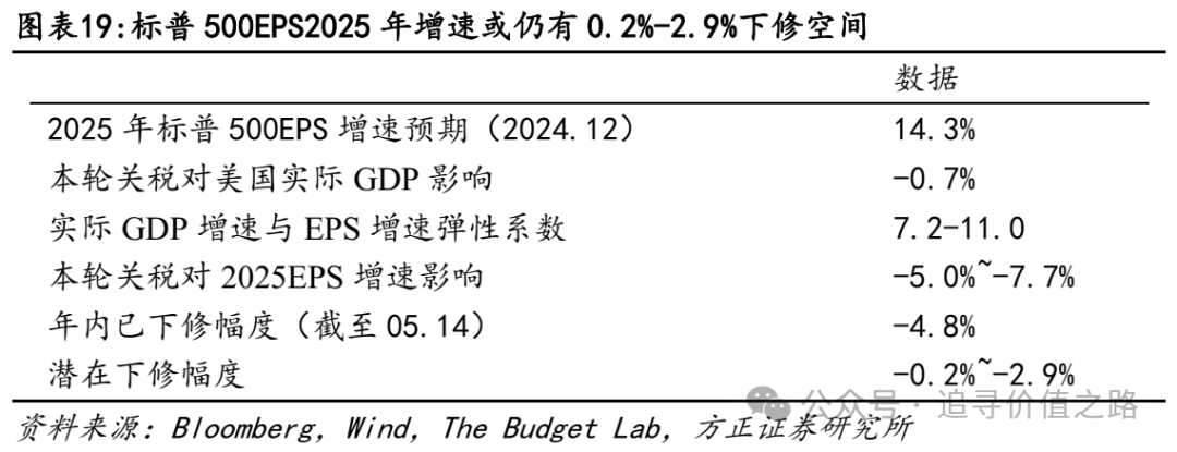 按定量测算,本轮特朗普关税或导致2025年美股盈利下修5.0%-7.7%,当前已下修4.8%,年内或还有0.2%-2.9%下修空间。美股盈利下修可用美股EPS与实际GDP的定量关系近似测算。参考The Budget Lab的研究,截至5月份的美国关税政策(考虑中美最新协议)或导致美国2025年实际GDP增速下行0.7个百分点。而实际GDP增速与标普500EPS增速的弹性系数在7.2-11.0附近,意味着本轮关税或导致2025年美股盈利下修5.0%-7.7%,年内或还有0.2%-2.9%下修空间。