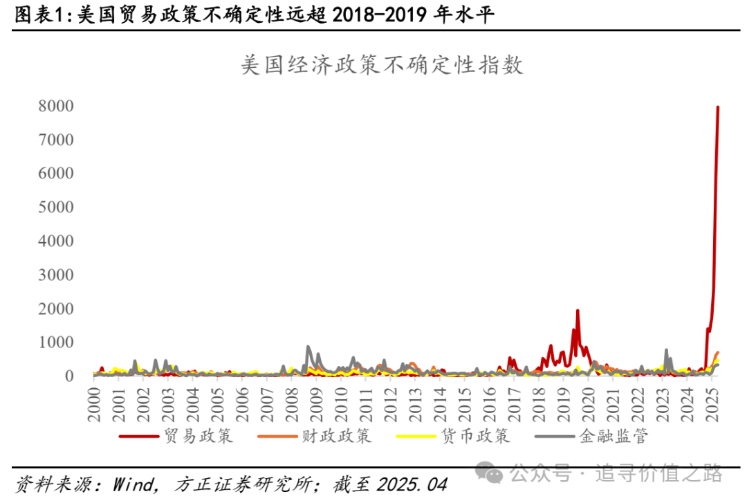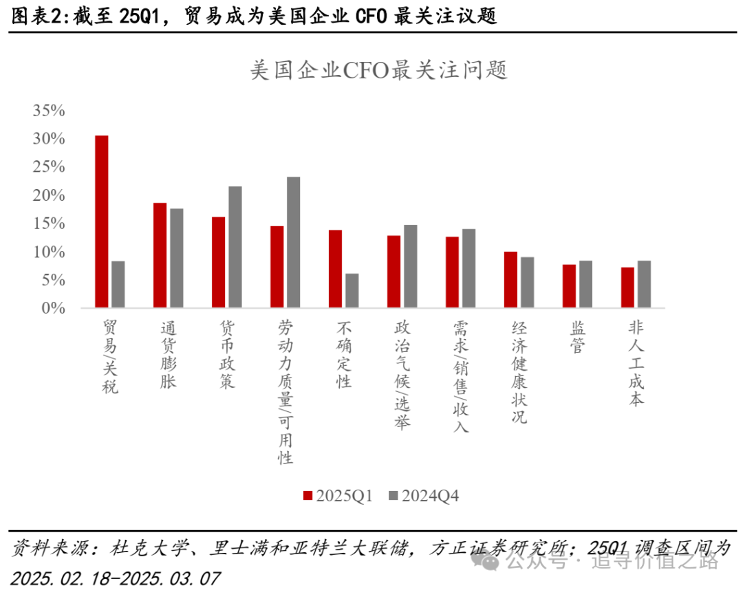 美国贸易政策持续构成全球经济和市场的最主要焦点问题。尽管市场对特朗普政府关税政策已有一定预期,但其上台后的政策节奏和强度超出市场预期。体现在政策不确定性上,美国贸易政策不确定性指数创1985年有统计以来最高值,远超其他类型政策,带动市场对美国经济和政策的不确定性大幅提升。从杜克大学对美国企业的微观调查数据看,截至25Q1,近三分之一的受访企业表示对第一季度的贸易政策或关税感到担忧,与第四季度相比大幅增加,贸易/关税已成为企业最关注问题。此外,“不确定性”首次进入前五大担忧。