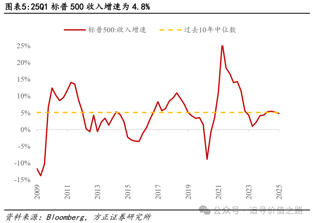 收入层面看,25Q1美股公司收入增速小幅下滑,25Q1标普500收入增速由上季度的5.2%降至4.8%。由于标普500是应用最广泛的美股宽基指数,占美股总市值比重约80%,因此本文主要分析其盈利情况。截至5月19日,500余家成分股中超90%公司已披露25Q1季报。对已公布Q1数据的采用其实际值、未公布的采用市场预期值进行计算,25Q1标普500收入增速为4.8%,较24Q4(5.2%)小幅下滑,略低于过去10年中位数(5.1%)。