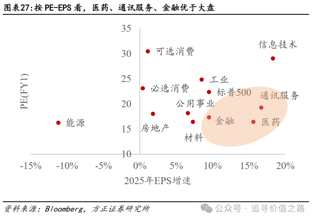当前位置对美股仍需偏谨慎,从行业配置上金融和通讯服务或相对占优。从PE-EPS角度看,医药、通讯服务、金融相较标普500而言,估值偏低但EPS预期增速较高,在标普500指数的11个子行业中相对占优。从关税扰动看,从2025年EPS增速预期的变化看,截至5月14日,大部分行业的2025年盈利预期增速均明显下修,而通讯服务(+1.7%)、金融(+0.6%)盈利预期甚至不降反升,表明其受关税影响或相对较小。