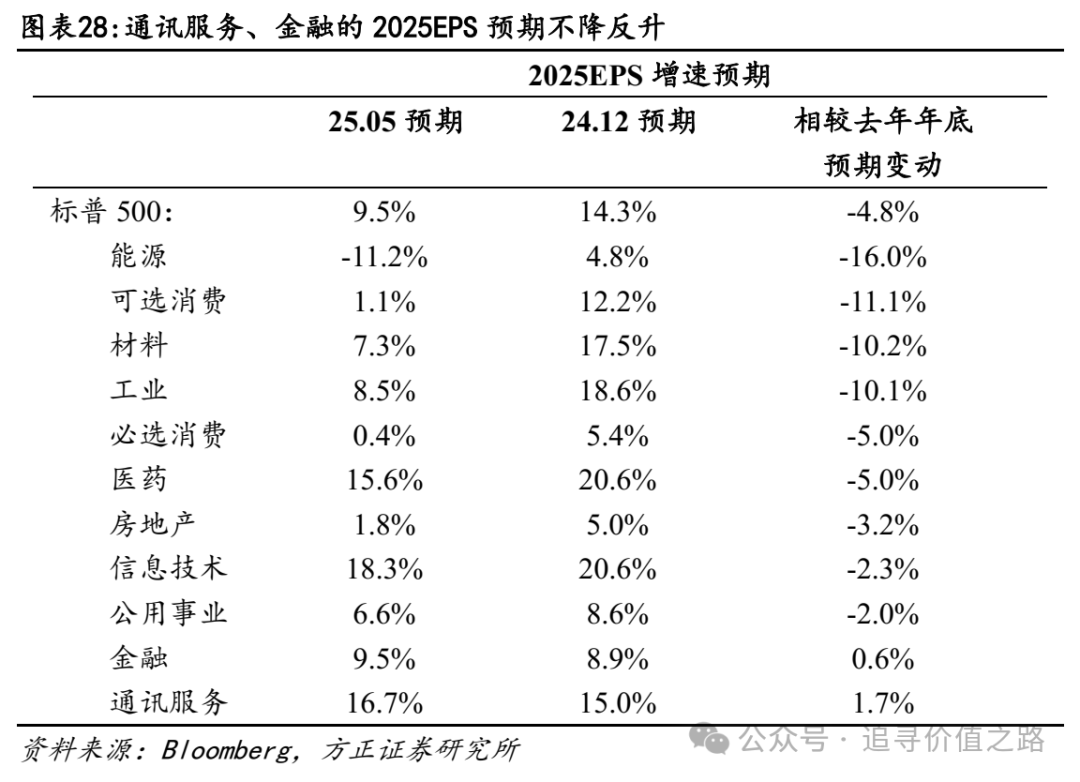 分行业看,大部分行业盈利预期下修,能源、可选消费、材料、工业等行业受关税政策的冲击或相对较大,盈利下修较为明显,通讯服务、金融则相对较小。从2025年EPS增速预期的变化看,截至5月14日,大部分行业的2025年盈利预期增速均明显下修,其中能源(-16%)、可选消费(-11.1%)、材料(-10.2%)、工业(-10.1%)的下修幅度居前,表明其受到的关税冲击更为明显,而通讯服务(+1.7%)、金融(+0.6%)、公用事业(-2.0%)受影响相对较小,其中通讯服务和金融盈利预期甚至不降反升。