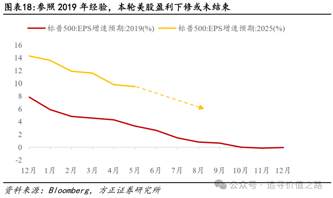 美股盈利增速预期持续下修,斜率最陡峭阶段或已过去,但大概率尚未结束。从历史经验看,本轮加关税的量级远大于2018年-2019年,意味着年内美股盈利下修大概率并未结束。参考2018-2019年经验,关税对美股EPS冲击在2019年全面体现,市场对2019年标普500的EPS增速预期从2018年12月的7.9%下修至2019年底的0%附近,下修幅度为-7.9%。而年初以来-4.8%的盈利下修幅度仍相对有限。
