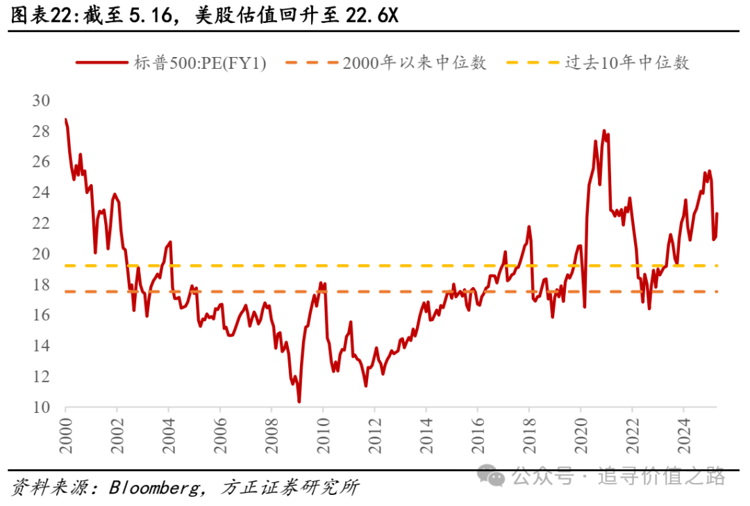 关税政策纠偏下美股估值从4月上旬的年内低点18.6X回升至22.6X,后续能否继续回升仍取决于关税政策演进,但当下估值很难说便宜。标普500指数PE(FY1)从2月最高的25.6X降至4月8日最低点的18.6X,带动美股大幅回撤。而4月中旬开始特朗普政府逐步修正关税政策,带动美股估值端大幅修复,到5月16日标普500的PE(FY1)再度回至22.6X。后续美股估值端能否继续修复,很大程度仍然取决于关税政策演进,但目前看仍然较大不确定性,且当下估值水位仍显著高于过去10年中位数(19.2X)和2000年以来中位数(17.5X),很难说还处于便宜区间。
