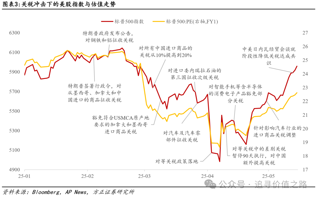 关税政策扰动下,2月以来美股呈现V形走势,体现为2月到4月上旬,关税政策持续加码下美股大幅杀估值,4月中旬以后随着关税政策纠偏,估值修复带动美股大幅反弹。2月以来对美股在内的全球风险资产而言,关税是最重要宏观变量。随着2月特朗普率先对墨西哥、加拿大、中国等商品征收关税,并扩展至钢铁和铝、汽车及零部件等多个品类,到4月2日演变为超预期的对等关税。体现在美股市场上,美股估值端大幅走弱,标普500指数PE(FY1)从2月最高的25.6X降至4月8日最低点的18.6X,带动美股大幅回撤。而4月中旬开始特朗普政府逐步修正关税政策,例如4月9日将对等关税中的差别关税暂停90天执行,4月11日对智能手机等含半导体的消费电子产品豁免部分关税,4月29日针对影响汽车行业的进口商品关税调整,以及最新的5月12日中美日内瓦经贸会谈就阶段性降低关税达成共识。受此带动,4月中旬开始美股估值端大幅修复,到5月16日标普500的PE(FY1)再度回至22.6X,带动美股明显反弹。
