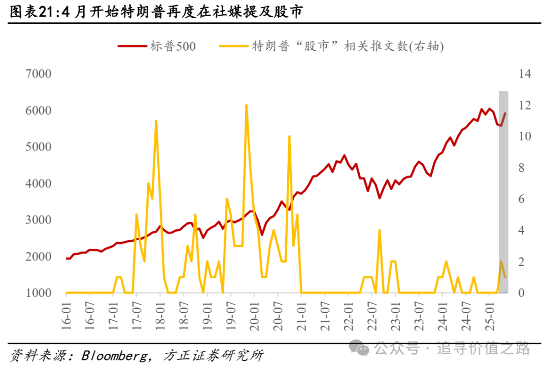 Trump Put其次体现为4月以来特朗普直接喊话买入美股,对股市的重视度显著提升。从历史经验看,特朗普1.0阶段,其对股市高度重视,将股市作为执政业绩的重要指标,在推特上频繁发布股市相关的文章,当美股持续上涨、创历史新高时,特朗普倾向将股市归功于自己的政策效果,而当美股经历下跌时,安抚民众并“甩锅”民主党、美联储等是其常规操作。而本轮加关税过程中,3月份特朗普口风还相对强势,在3月6日的采访中表示在制定关税政策细节时不会考虑股市的反应,并将近期股市下跌归咎于“全球主义者”。但到4月特朗普就股市发声频次提升,4月9日发文称“现在是买入的绝佳时机”,5月8日再度在社交媒体上呼吁公众买股票,反映其对股市的重视程度明显提升。