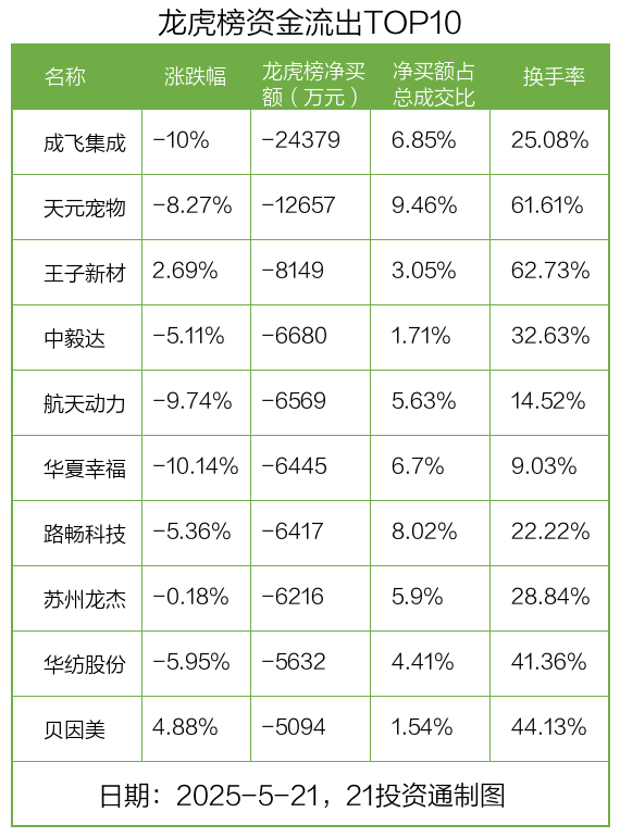 而龙虎榜中资金净流出最多的是成飞集成(002190.SZ),被净卖出为2.44亿元,占总成交金额的6.85%。成飞集成收盘下跌10%,换手率为25.08%。