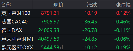 德国DAX指数跌0.11%,法国CAC40指数跌0.46%,英国富时100指数涨0.12%。