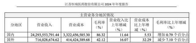 想再进一步,唯有寻求全球市场的突破。2024年,恒瑞医药海外销售收入仅为7.16亿元,占公司营收的比重不足3%,且毛利率还比上年减少了7.1%,同期百济神州海外营收占比高达63%,国际化之路仍任重道远。