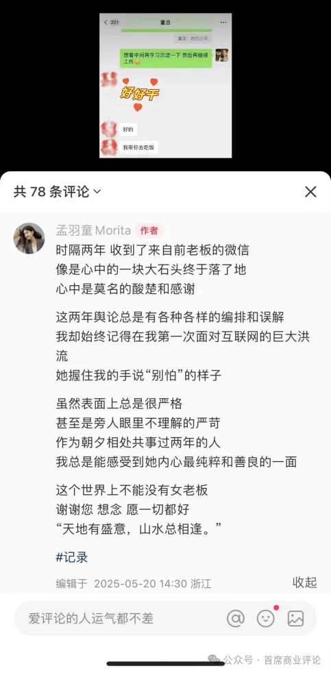 另一方面,孟羽童也可以吃到一波迟到的情感营销红利。通过师徒破冰主题,以“职场关系修复”为噱头,想必也能再次激发公众情感共鸣。一旦成功,再给自己的职场人设来波新助攻,可谓是一鱼多吃。