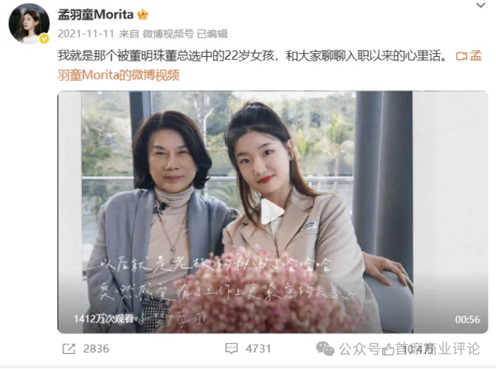2021年,22岁的孟羽童通过综艺《初入职场的我们》进入董明珠视野。她以“策划董明珠舞蹈表演”的创意展现高情商,被董明珠评价“像年轻时的自己”,并高调宣称要将其培养为“第二个董明珠”。