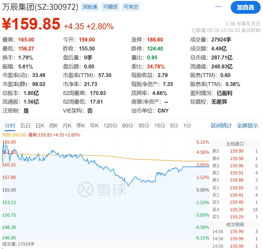 受该消息影响,万辰股价今日高开后回落。截至收盘,该股报159.85元/股,上涨2.8%。