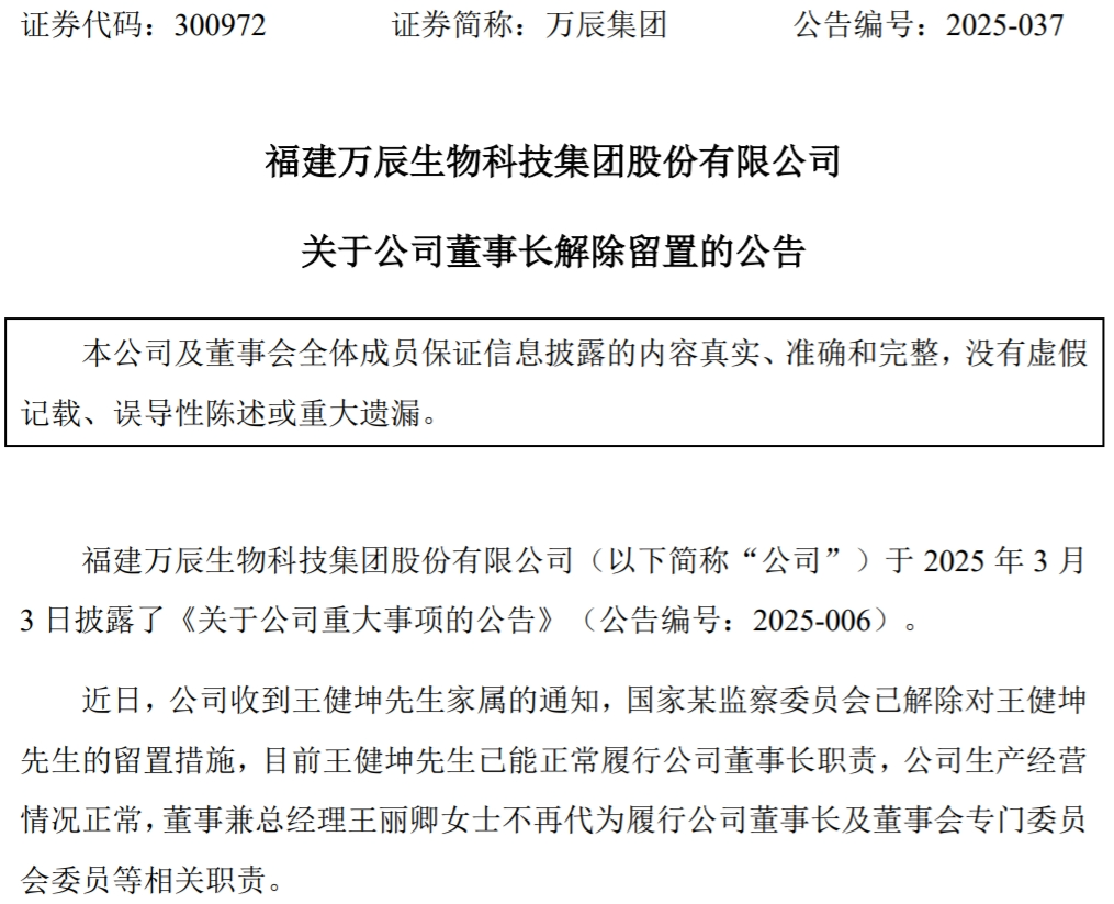今日早间,万辰集团(300972.SZ)发布公告称,公司董事长王健坤已被解除留置措施,现可正常履职。