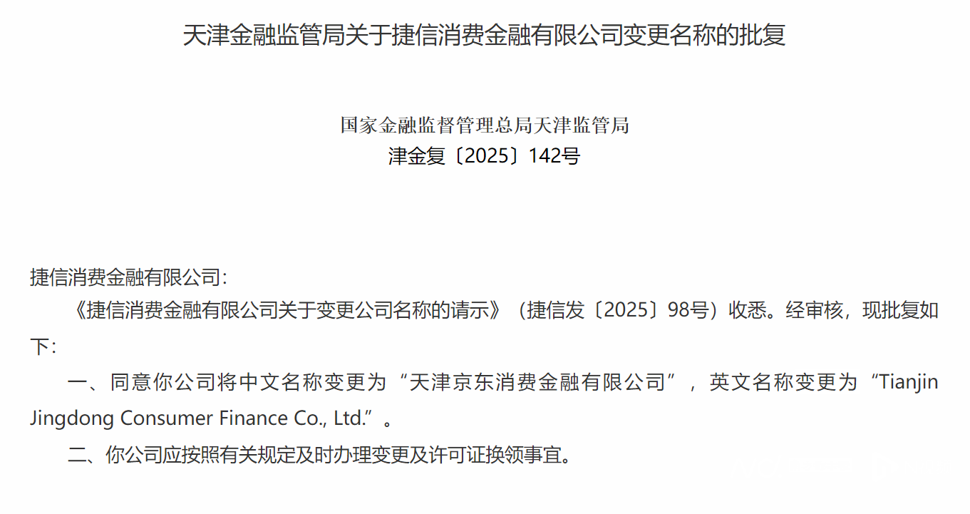 日前,国家金融监督管理总局天津监管局发布公告称,同意捷信消费金融有限公司(以下简称“捷信消金”)将中文名称变更为“天津京东消费金融有限公司”(以下简称“京东消金”)。